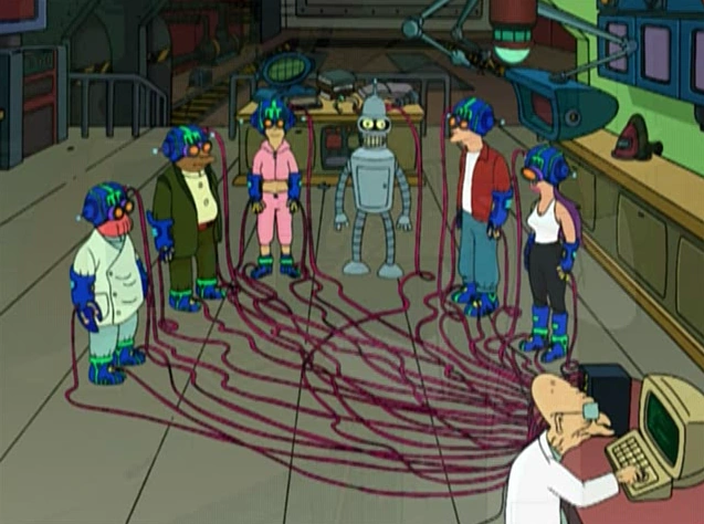 The Net suit is a set of gloves, helmet, shoes, and boots that, when worn, allow the user to access the internet in a virtual form. They have also been used to control micro versions of themselves. They are said to smell like burning rhesus monkey but you don't notice it after a while. Bender is the only character in Planet Express that doesn't need the net shoes or helmet because a cable is inserted into his head.