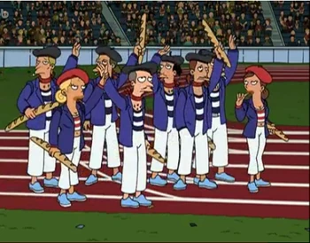 The Republic of French Stereotypes is a nation on Earth that participated in the 3004 Earth Olympics. Its inhabitants represent most of the French stereotypes: They wear berets, have cigarettes in their mouths, wear striped shirts and hold baguettes in their hands. According to Leela, everybody hates them.
