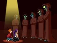Alcazar: Leela almost married Alcazar after he tricked her into thinking they were the last of their race and began treating her like a servant. However, Fry and Bender exposed him as womanizing sleaze who attempted to marry other women, resulting in her beating him up and ridiculing him.[15]