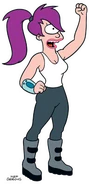 After growing up, Leela begins work at Applied Cryogenics as a Fate Assignment Officer, code number "1BDI" (one beady eye). When Leela meets Philip J. Fry, she becomes a job deserter in favor of piloting for Planet Express.[5] Leela lived alone in a small unfurnished apartment, "1I" (one eye) in New New York City.[6] In 3023, she moves with Fry at his and Bender's Robot Arms apartment.[7]She was named Orphan of the Year in 3000[8] and for a short while, Miss Universe.[9] Due to an accident, she and Kif Kroker have several children together, though Amy Wong, as Kif's "Fonfon Ru", is considered the mother.[10]