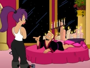 Leela met Zapp enroute to Vergon 6. She took pity on him and had sex with him, something she regrets constantly.[18] Zapp believes he still has a chance with Leela and hits on her every time they meet. Zapp frequently reminds Leela about her one-night stand with him, to her disgust.
