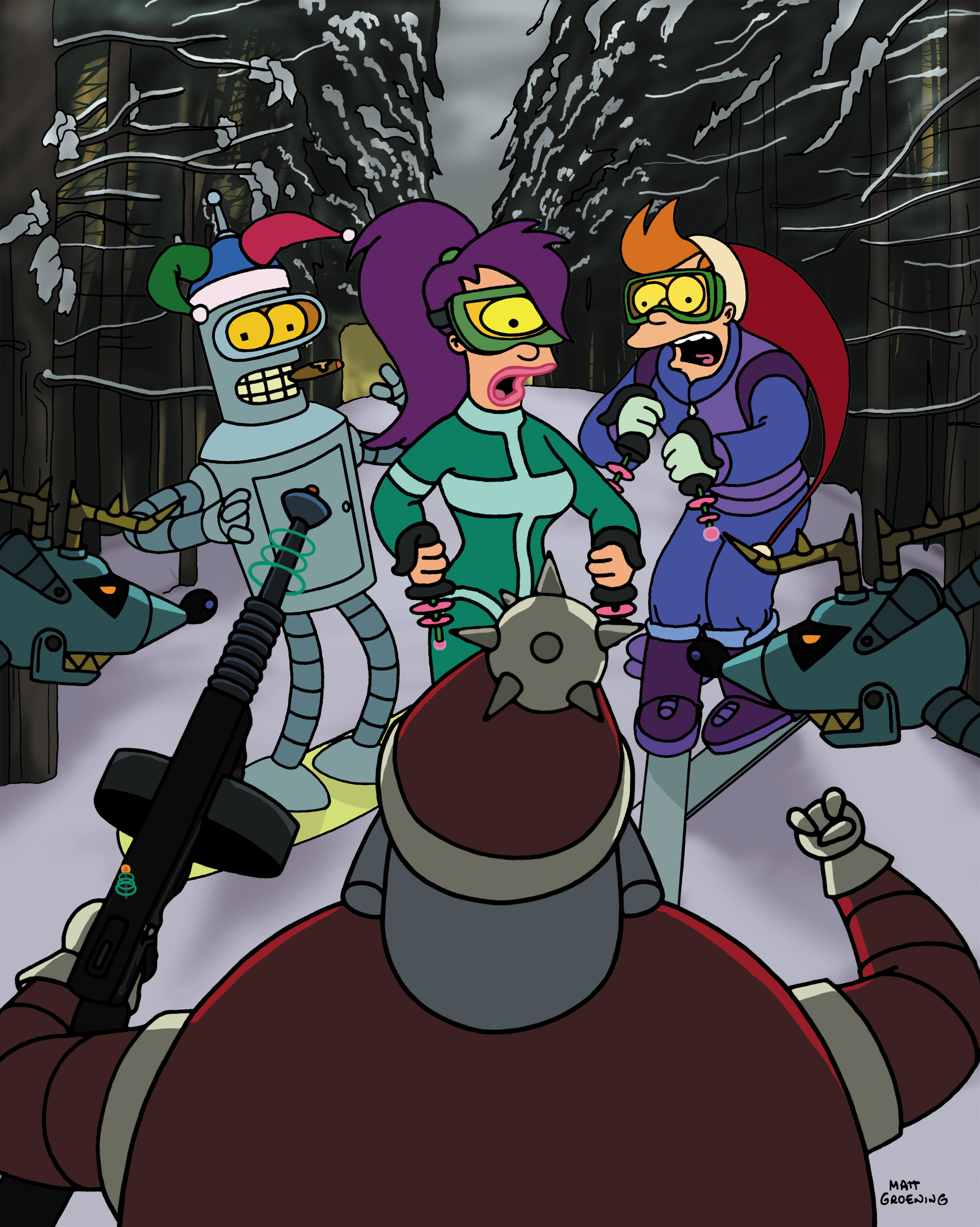 Fry decides to venture into the city to buy Leela a present, although she hadn't felt happy about Xmas when she was an orphan. The others warn him to be back before sundown, or else he will be killed by a murderous robotic Santa Claus. In the year 2801, The Friendly Robot Company had made up a robotic version of St. Nick himself to determine who had been naughty and who had been nice. Unfortunately, due to a programming error, the jolly robotic elf soon turned into a mad murderer when his standards were set too high and at sundown, he will kill anyone who has been naughty. Meanwhile, Bender befriends several homeless robots and goes on a robbery spree.